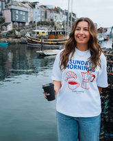 The Sunday Mornings tee is all about slow starts, good coffee and coastal living. Featuring a hand-drawn moka pot, croissant and cup illustration, it celebrates the ritual that built our brand weekend caffeine, Cornish views and no rush.